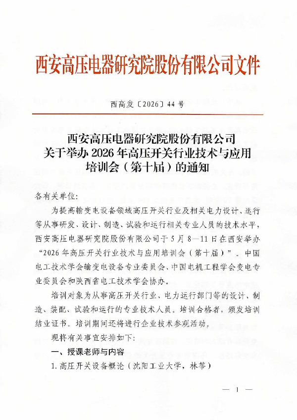 关于举办2026年高压开关行业技术与应用 培训会(第十届)的通知