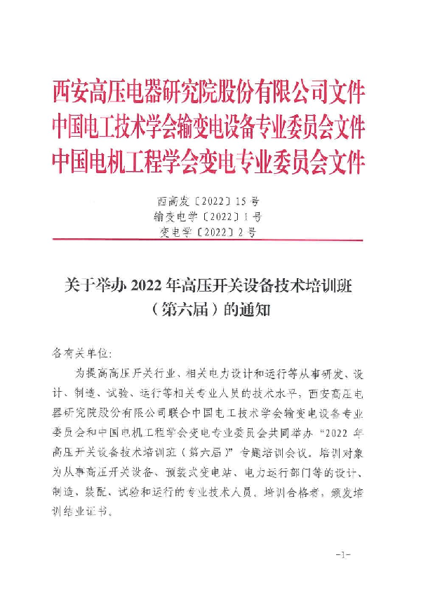 西高院关于举办2022年高压开关设备技术培训班(第六届)的通知