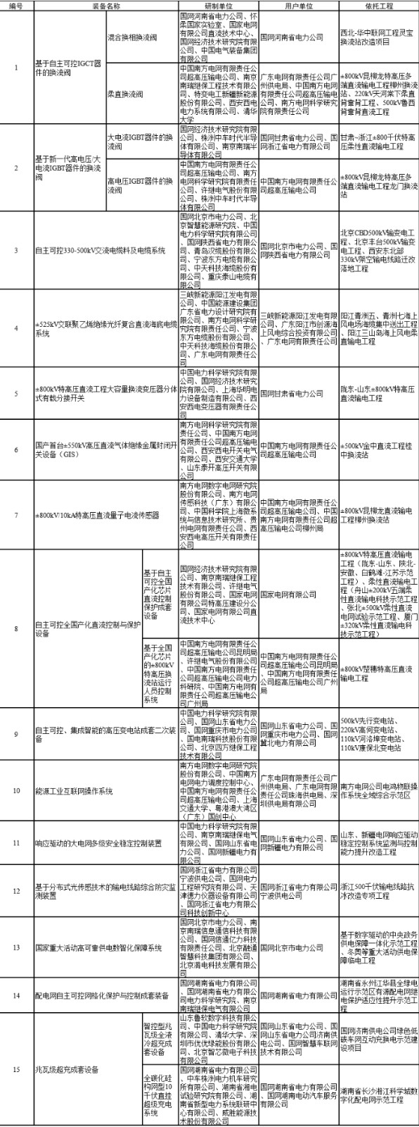 其中包括基于自主可控IGCT器件的换流阀(混合换相换流阀、柔直换流阀)、基于新一代高电压/大电流IGBT器件的换流阀(大电流IGBT器件的换流阀、高电压IGBT器件的换流阀)、自主可控330-500kV交流电缆料及电缆系统、±525kV交联聚乙烯绝缘光纤复合直流海底电缆系统、±800kV特高压直流工程大容量换流变压器分体式有载分接开关、国产首台±550kV高压直流气体绝缘金属封闭开关设备(GIS)、±800kV/10kA特高压直流量子电流传感器、自主可控全国产化直流控制与保护设备(基于自主可控全国产化芯片直流控制保护成套设备、基于全国产化芯片的±800kV特高压换流站运行人员控制系统)、自主可控、集成智能的高压变电站成套二次装备、响应驱动的大电网多级安全稳定控制装置、基于分布式光传感技术的输电线路综合防灾监测装置、国家重大活动高可靠供电数智化保障系统、配电网自主可控网格化保护与控制成套装备、兆瓦级超充成套设备(智控型兆瓦级全液冷超充成套设备、全碳化硅构网型10千伏直挂超级充电系统)等电力装备。